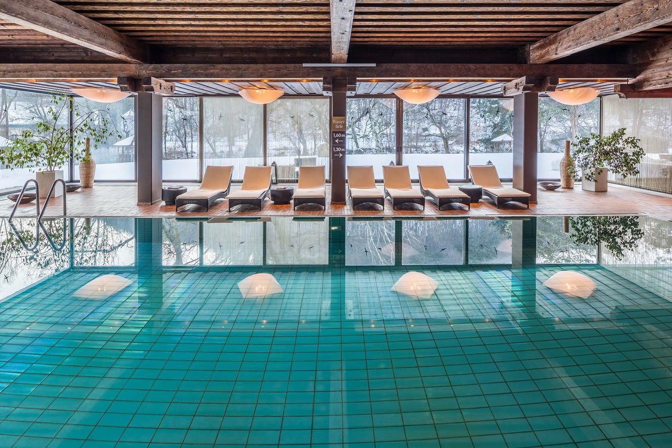 Im Spa-Bereich finden Sie einen Innenpool, eine Sauna, einen modernen Fitnessraum und eine große Liegewiese mit Hängematten.